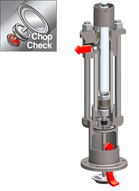 A série de bombas Chop-Check possuem um pistão de injeção para “alimentar” o material na bomba. Eles são normalmente utilizados em conjunto com uma placa seguidora para forçar o material para baixo. Isso evita a perda pela canalização – uma condição na qual a entrada da bomba fica cercada de ar devido à cavidade formada quando um material de alta viscosidade não estabiliza quando é removido (capacidade de decapagem).